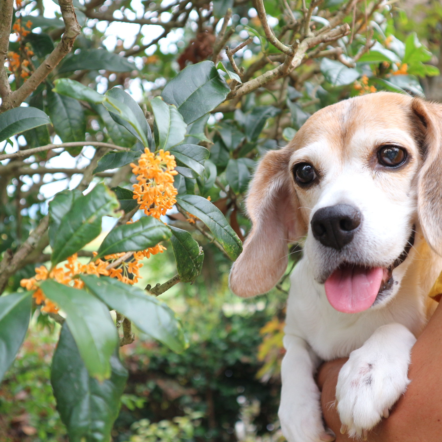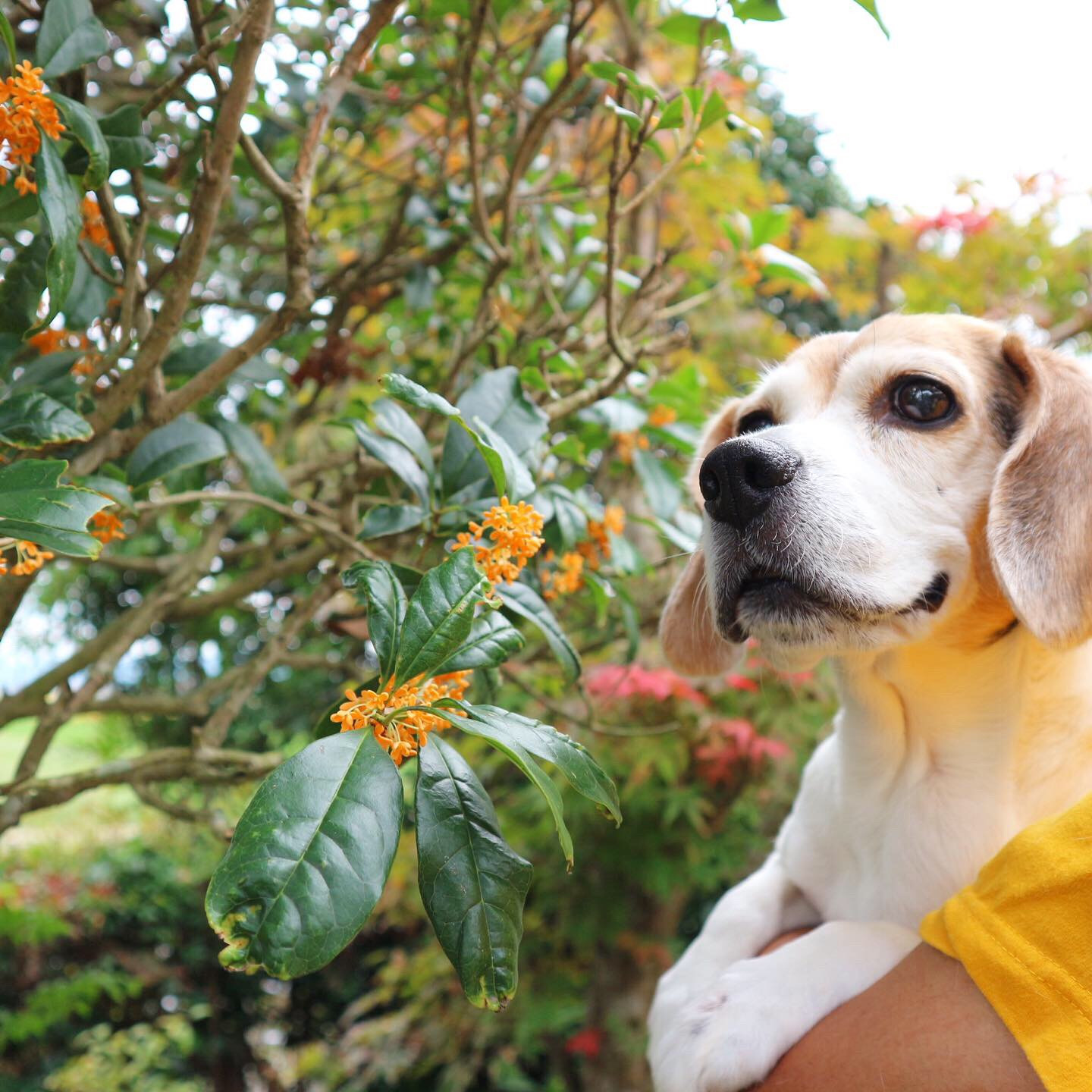 写真は、亡き愛犬ソラと金木犀の思い出写真。