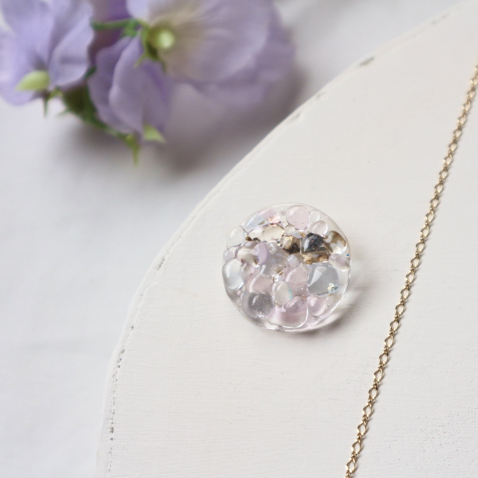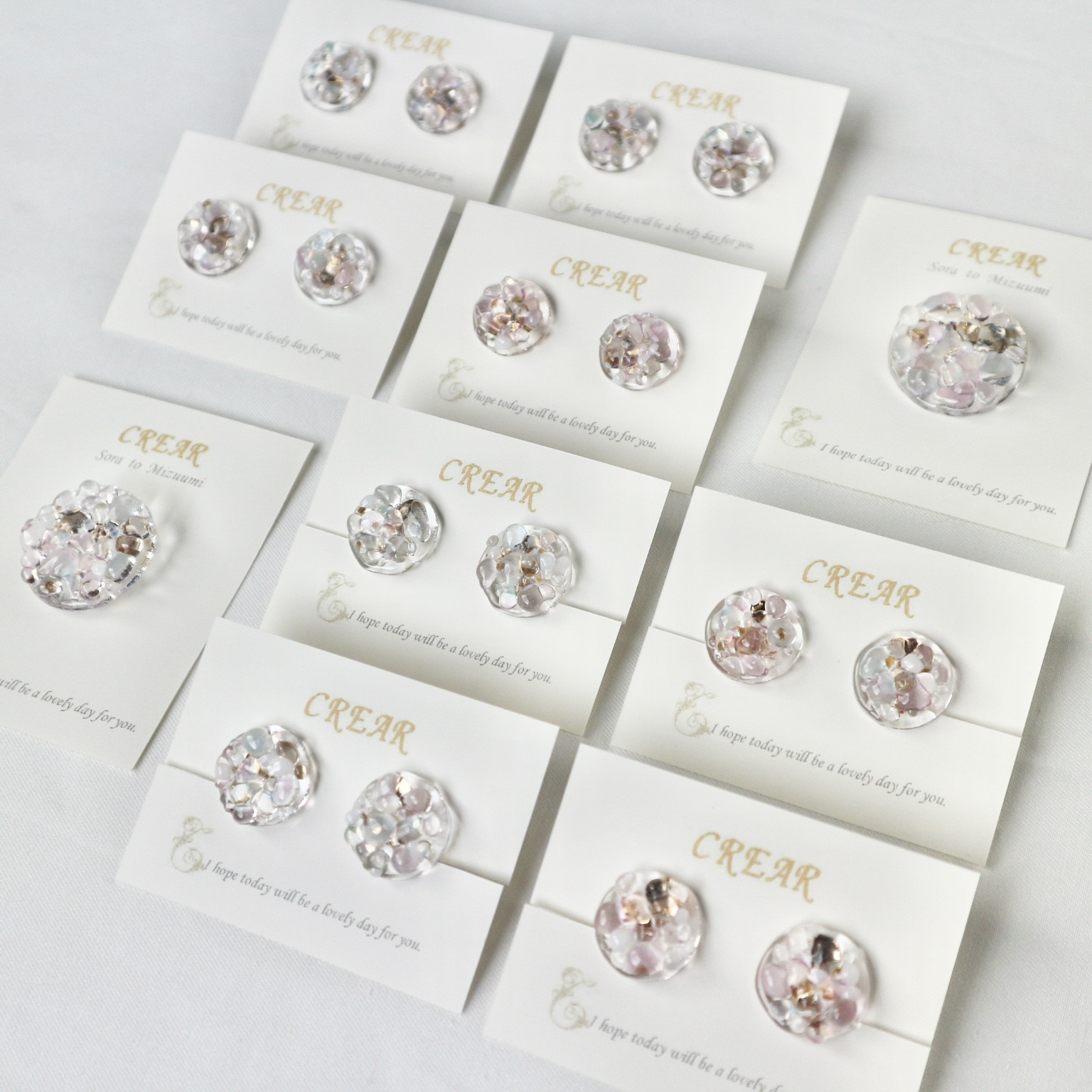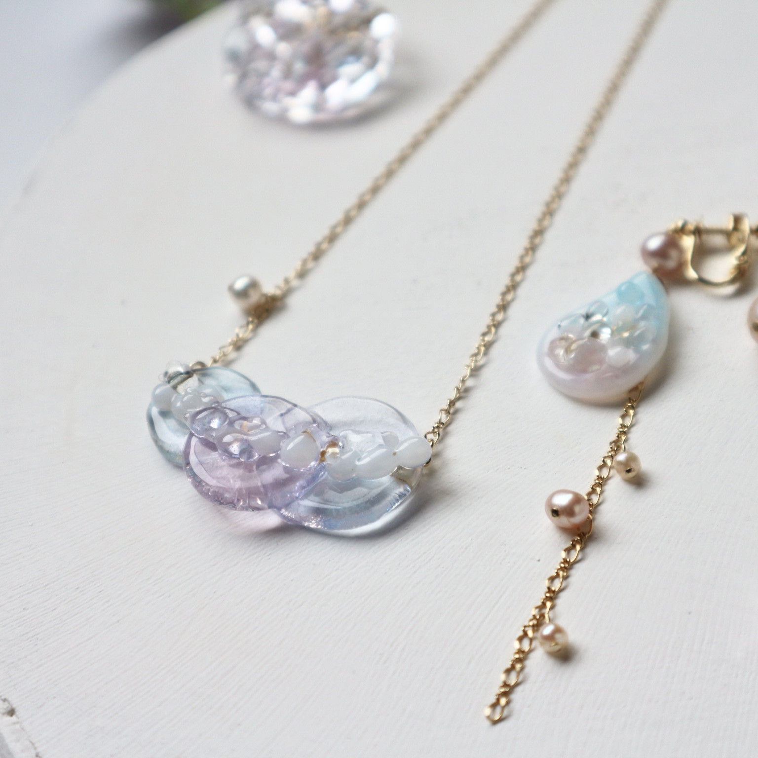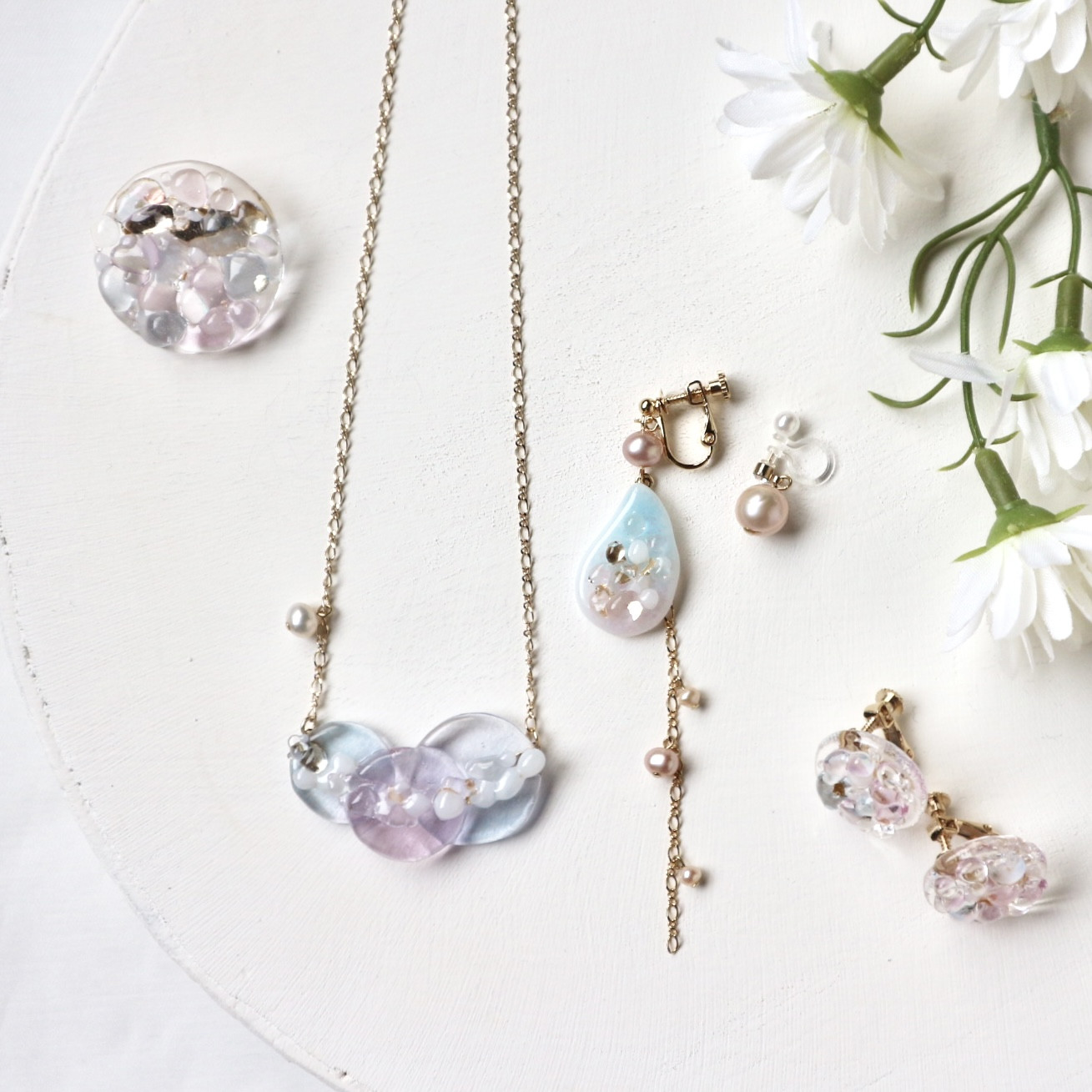 ガラスアクセサリーほんのり淡い幸せ色に仕上げたガラスたち♪どれも違ってオンリーワンの色合いです。透明系のアイテムはさりげなく身に着けていただけます♪